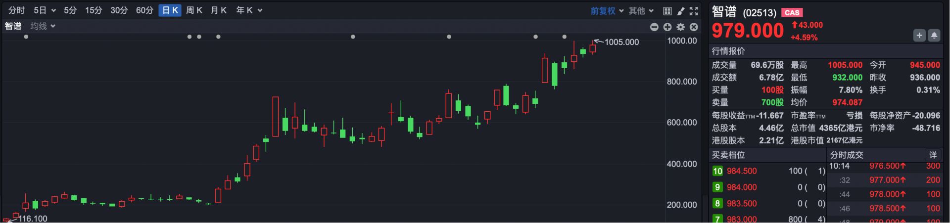 4月13日,国产AI龙头智谱(HK02513)盘中股价突破1000港元大关,最高触及1005港元,成为港股年内第二只跻身千元股行列的个股。