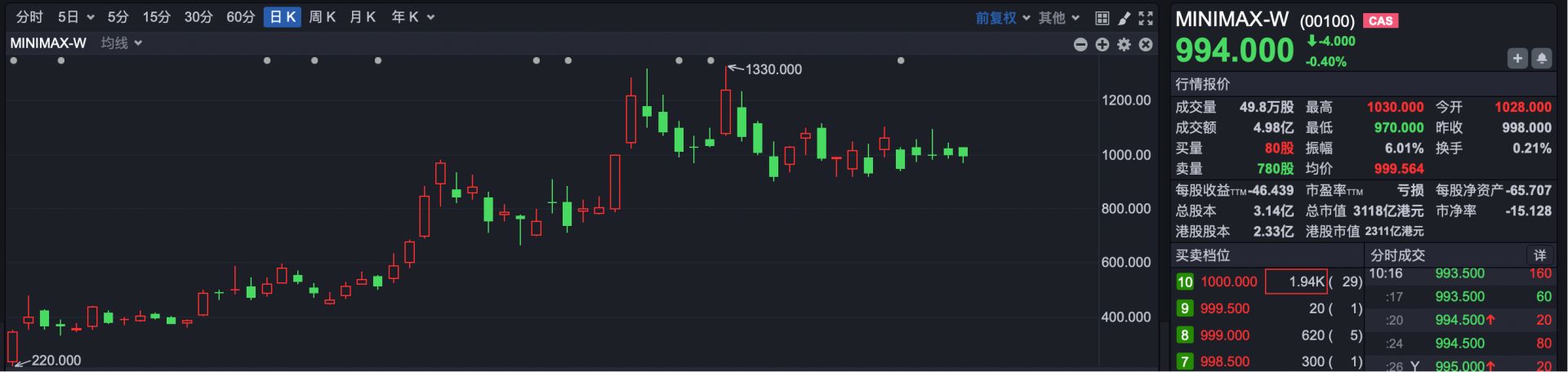 而在智谱之前,1月9日上市的MINIMAX-W已于3月9日率先突破千元,最高触及1330港元,两只AI新股在短期内相继登顶,共同改写了港股高价股版图。
