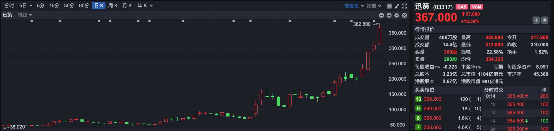 “词元第一股”迅策(HK03317)今日一度涨超20%,最高价报382.8港元,上市以来累计涨幅高达697%。