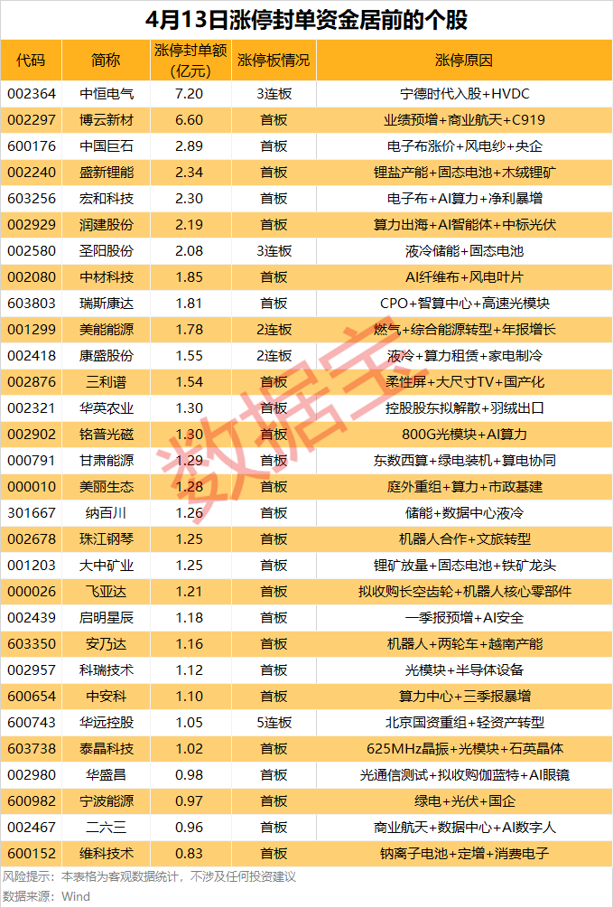 以封单金额计算,中恒电气、博云新材、中国巨石等涨停板封单资金最多,分别有7.2亿元、6.6亿元、2.89亿元。