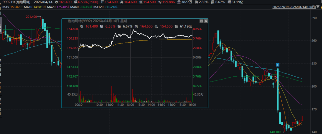 4月以来,泡泡玛特股价一度在140—150港元左右盘整。泡泡玛特3月25日发布的2025年财报显示,公司全年实现营收371.2亿元,同比增长184.7%;经调整净利润130.8亿元,同比增长284.5%。尽管盈利增速良好,但市场对于泡泡玛特的增长预期降温,公司股价在随后几个交易日连续下挫。3月,泡泡玛特累计跌幅超37%。