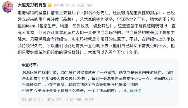 他还在4月9日总结了泡泡玛特构建的商业壁垒:已经建立起来的用户关注度(品牌)、艺术家的签约壁垒、全球各地的门店、强大的王宁(泡泡玛特创始人)和他的团队。“这些壁垒不能保证潮玩可以一直有人喜欢,但可以让喜欢潮玩的人们一直关注泡泡玛特。泡泡玛特的壁垒远比想象中强大,只要潮玩有持续性,泡泡玛特就是非常好的生意了。”