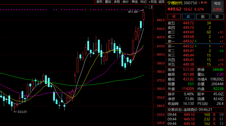 早盘,宁德时代A股高开,盘中涨超4%,A股总市值突破2万亿元,反超中国石油,跃居A股总市值第三位。另外,宁德时代港股一度涨近8%。