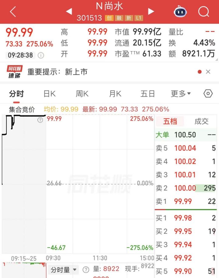 N尚水今日上市,开盘价99.99元,上涨275.06%。
