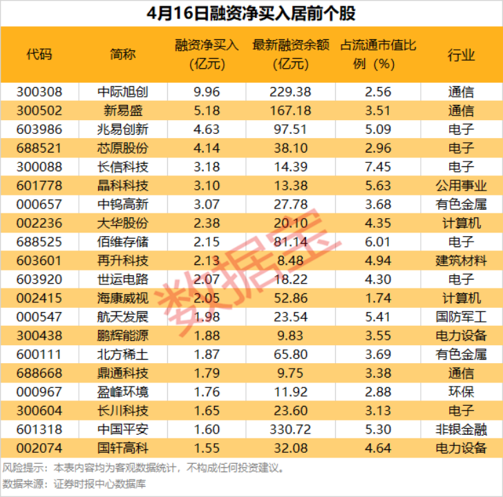 具体到个股,4月16日共有1955只股获融资净买入,净买入金额在1亿元以上的有47只,其中7只融资净买入额超3亿元。中际旭创融资净买入额居首,当日净买入9.96亿元,其次是新易盛、兆易创新,融资净买入金额分别为5.18亿元、4.63亿元,融资净买入金额居前的还有芯原股份、长信科技、晶科科技等。