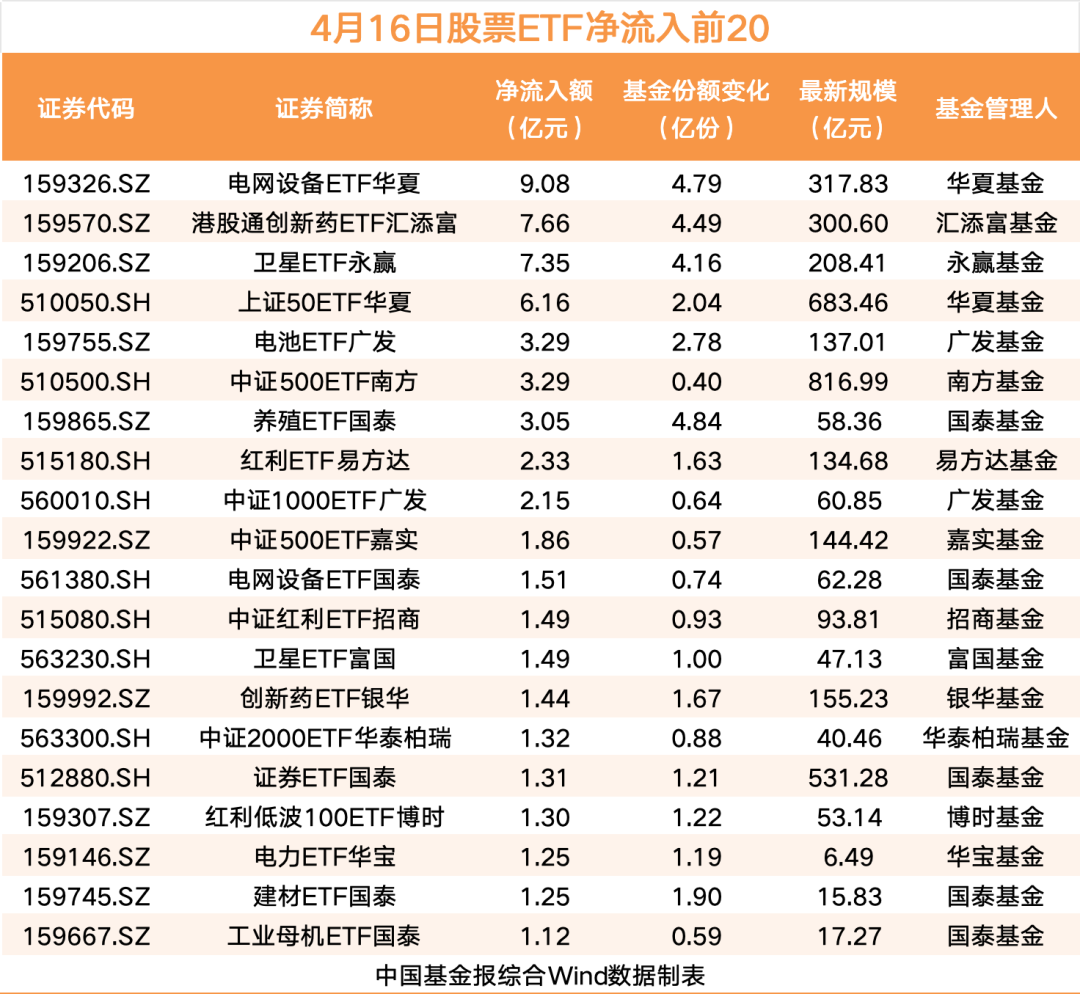 具体来看,共有21只ETF资金净流入超1亿元。其中,电网设备ETF华夏以9.08亿元的资金净流入排在首位;港股通创新药ETF汇添富、卫星ETF永赢排在第二、第三位,资金净流入分别为7.66亿元、7.35亿元。