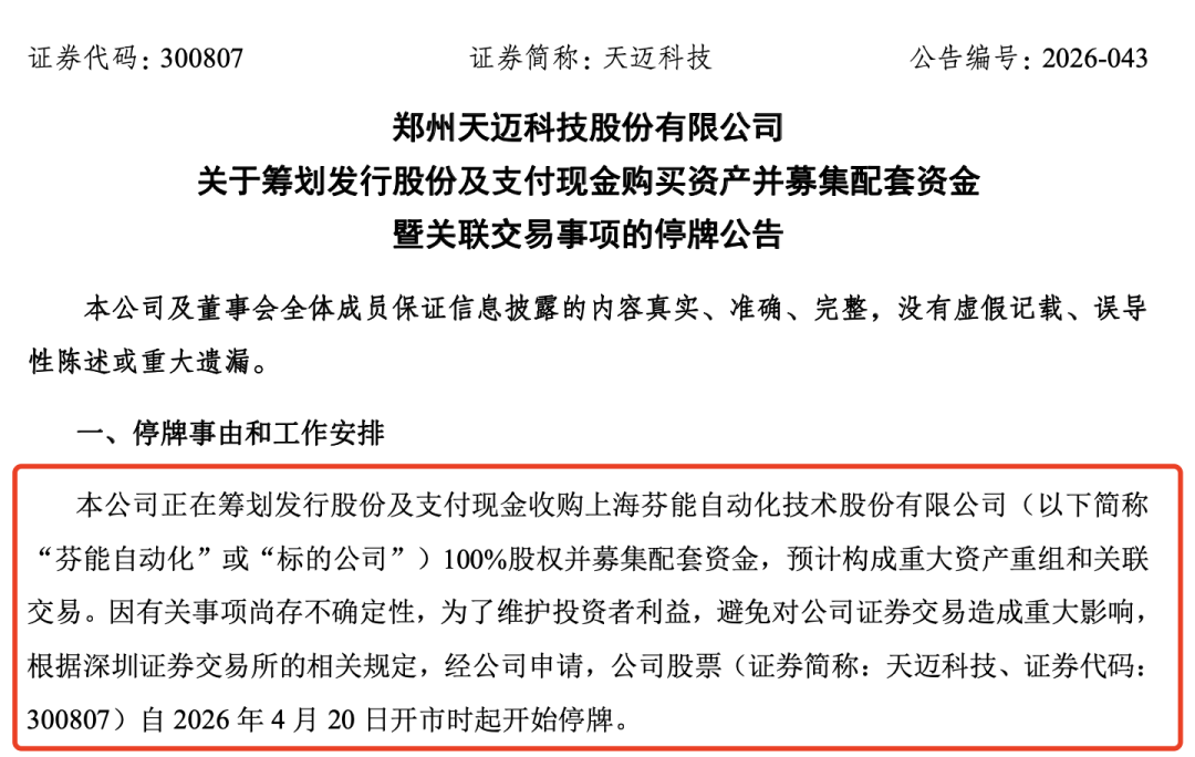 今日(4月19日),天迈科技发布公告称,公司正在筹划发行股份及支付现金收购上海芬能自动化技术股份有限公司(以下简称“芬能自动化”)100%股权并募集配套资金,预计构成重大资产重组,公司股票自4月20日起停牌。