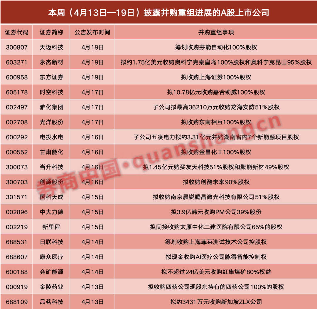 据不完全统计,截至发稿,本周(4月13日—19日)披露并购重组进展的A股上市公司共有18家,包括天迈科技、永杰新材、东方证券、时空科技、雅化集团、光洋股份、电投水电、甘肃能化、当升科技、创源股份、国科天成、中大力德、新里程、日联科技、康众医疗、兖矿能源、金陵药业、品茗科技。