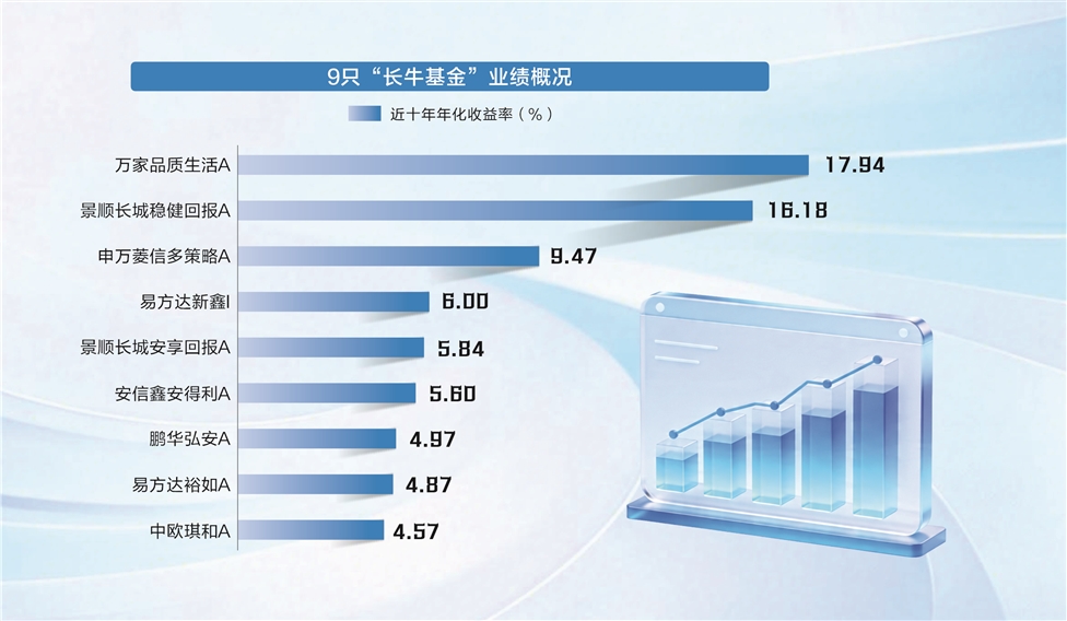 在A股结构性行情中,净值能创历史新高的基金本就不多,而能够跨越10年牛熊周期、实现年度净值持续创新高的产品更是寥寥无几。在这轮反弹中净值创历史新高的主动权益基金中,若聚焦成立超10年的产品,仅有9只“长牛基金”在2016年至2025年的10年间(以下简称“近10年”),每年净值(按复权单位净值统计,下同)均突破此前历史最高点,达成了连续10年“年年新高”的长期业绩纪录。