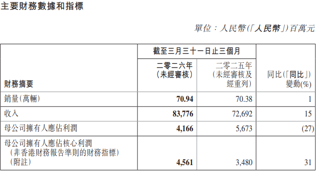 吉利汽车在港交所公告,2026年第一季度收入837.76亿元,同比增长15%;母公司拥有人应占利润41.66亿元,同比下降27%。