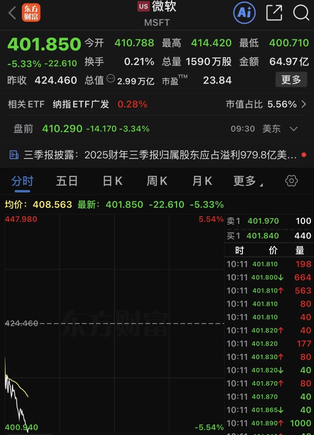 微软股价下跌5.33%,报401.850美元/股,总市值报2.99万亿美元。