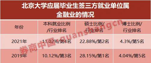北京大学的金融领域就业情况也有相似变化。《北京大学2021年毕业生就业质量年度报告》显示,从就业单位行业分布来看,去往金融业就业的北大硕士生有明显减少,2021年有22.88%硕士生在金融领域就业,行业排名第2位,而在两年前,2019年有28.15%的硕士生在金融领域就业,行业分布中排名第一。