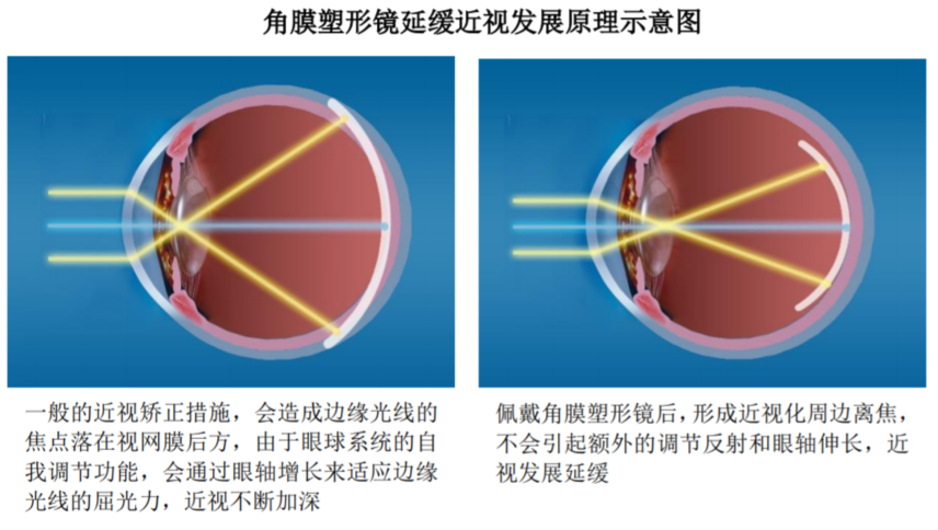 一般在近视发生后,通常是配戴框架眼镜进行视力矫正。虽然这能够将中心光线的焦点调整到视网膜上,但边缘光线的焦点会落在视网膜后方。而眼球具备自我调节功能,会通过眼轴增长来适应边缘光线的屈光力,后果为眼轴不断增长,近视不断加深。