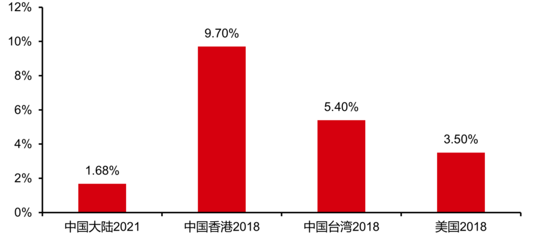 专业机构数据显示,2018年角膜塑形镜在美国渗透率达3.5%,在中国香港渗透率达9.7%,在中国台湾渗透率约为5.4%,但2018年角膜塑形镜市场在中国内地渗透率仅约为0.88%。时至2021年,中国内地角膜塑形镜市场渗透率也仅为1.68%左右,角膜塑形镜行业仍处于普及阶段。