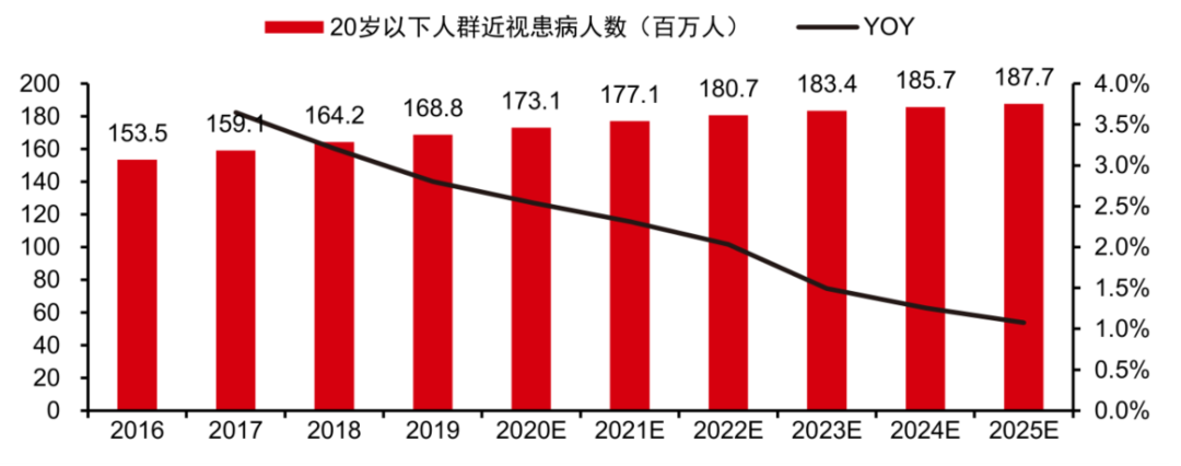 据2018年世卫组织报告,中国近视患者已超6亿人,并呈现逐年增长态势。同时中国儿童青少年近视率及近视人口数量高居世界第一。据弗若斯特沙利文(转引自欧康维视招股说明书)统计,2015-2019年中国20岁以下近视人数从1.48亿人增长至1.69亿人,该机构预计2025年将达1.88亿人,2030年将达到1.91亿人,儿童青少年近视防控需求十分迫切。