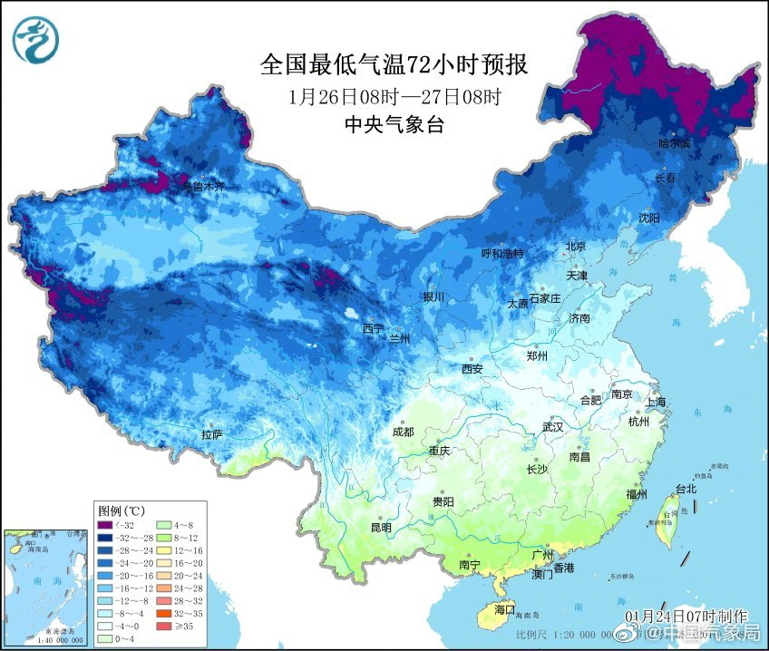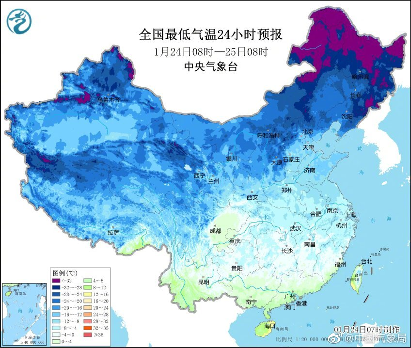 中央气象台1月24日6时继续发布寒潮蓝色预警。