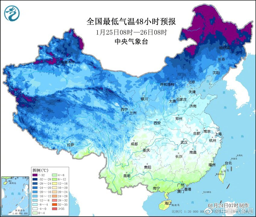 受寒潮影响,预计,1月24日8时至25日8时,黄淮南部、江汉东部、江淮、江南大部、华南、云南东部等地气温将下降6~8℃,其中,浙江东部和南部、福建大部、江西中南部、广东北部等地部分地区气温下降8℃以上,局地降温超10℃。上述地区先后有4~6级风,阵风7~8级。我国近海大部海域有6~8级风,阵风9~10级。过程最低气温出现在25日早上,最低气温0℃线将位于云南东部、贵州南部至华南北部一线。