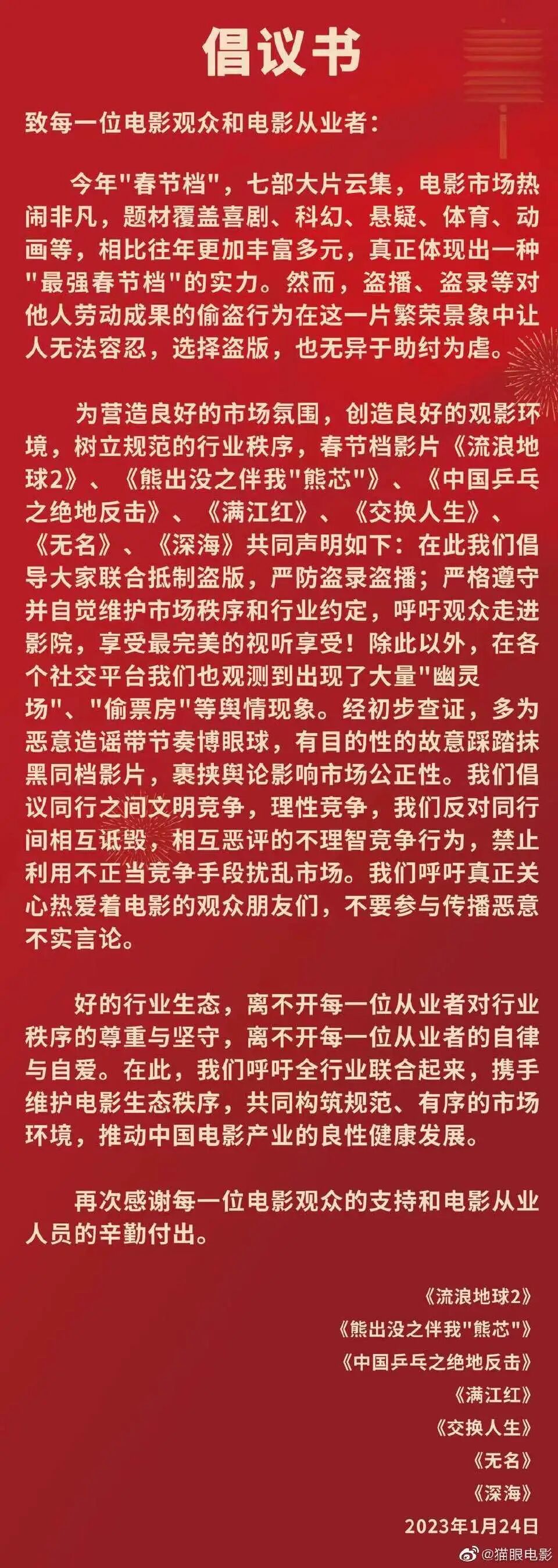 1月24日,春节档新片《流浪地球》《熊出没之伴我“熊芯”》《中国乒乓之绝地反击》《满江红》《交换人生》《无名》《深海》联合发布《倡议书》及专属海报,向全社会发声,呼吁每一位电影观众和电影从业者在观影过程中“保护版权、文明观影”,“抵制盗版、摄屏行为”。