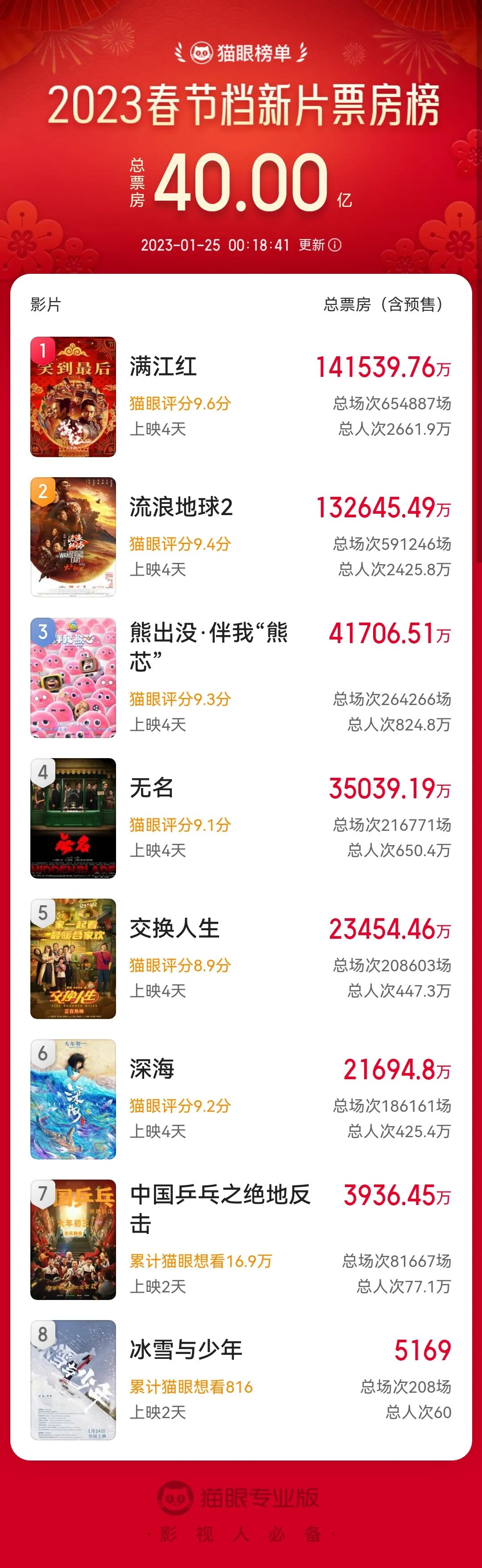 紧接着,初四零时18分,春节档新片总票房也来到40亿元。