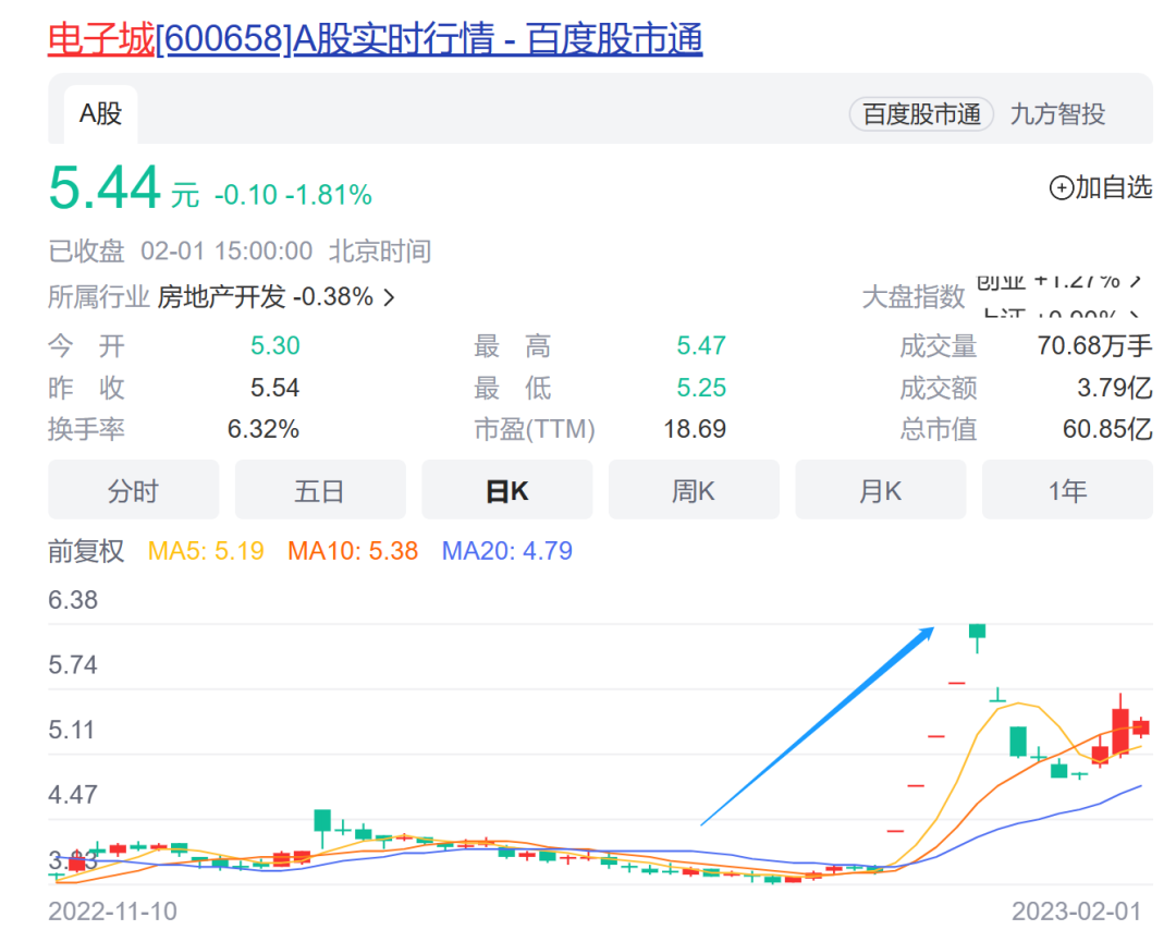 受此利好消息影响,电子城股价持续受到资金追捧。在1月7日开盘后连续收获了4个一字涨停板,第五个交易日继续冲高当日收涨7.7%,此后该公司股价开始震荡回调,最新报收5.44元/股。发布业绩预告至今,电子城累计涨幅仍超过37%。