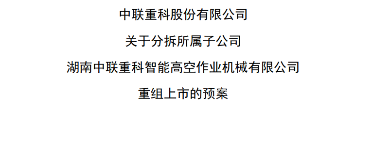 2月5日晚,中联重科发布公告称,拟分拆所属子公司中联高机重组上市的预案。同晚,路畅科技披露,拟发行股份购买中联高机并募资配套资金暨关联交易预案。