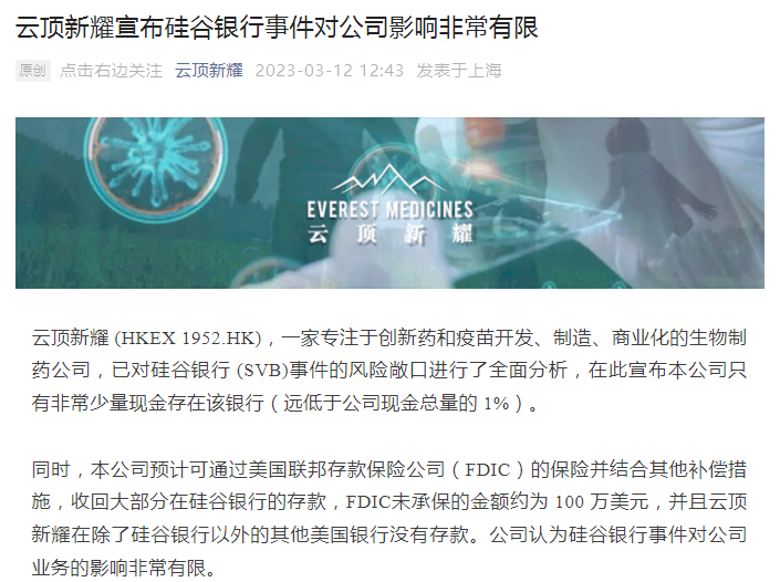 作为一家专注于创新药和疫苗开发、制造、商业化的生物制药公司,3月12日云顶新耀(01952.HK)表示,已对硅谷银行(SVB)事件的风险敞口进行了全面分析,宣布公司只有非常少量现金存在该银行(远低于公司现金总量的1%)。同时该公司预计可通过美国联邦存款保险公司(FDIC)的保险并结合其他补偿措施,收回大部分在硅谷银行的存款,FDIC未承保的金额约为100万美元,并且云顶新耀在除了硅谷银行以外的其他美国银行没有存款。公司认为硅谷银行事件对公司业务的影响非常有限。更多内容请看《》