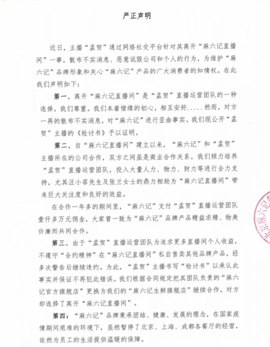面对孟贺控诉,麻六记在3月28日的声明中指出,离开麻六记直播间是孟贺直播运营团队的一种选择,予以尊重。但对方一再散布不实消息,对麻六记进行歪曲事实。声明同时公布了双方从合作到“闹掰”的全部过程。