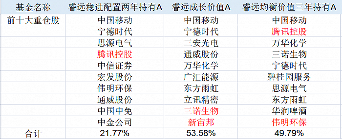 具体到前十大重仓股,三只基金的头号重仓股均是新晋的市值一哥中国移动(00941.HK)。截至一季度末,睿远成长价值持有中国移动4216.1万股,相比去年年末的4338.3万股减少了122.2万股;睿远稳进配置两年则持有1265万股中国移动,相比去年年末1317.75万股减少了52.75万股;睿远均衡价值三年持有2700万股中国移动,相比去年年末没有变化。