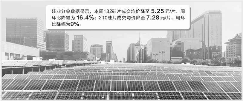 硅片价格也在本周出现了10%以上的跌幅。硅业分会数据显示,本周182硅片成交均价降至5.25元/片,周环比降幅为16.4%;210硅片成交均价降至7.28元/片,周环比降幅为9%。InfoLink给出的两种硅片报价略高于硅业分会,降幅分别为12.1%和7.8%。