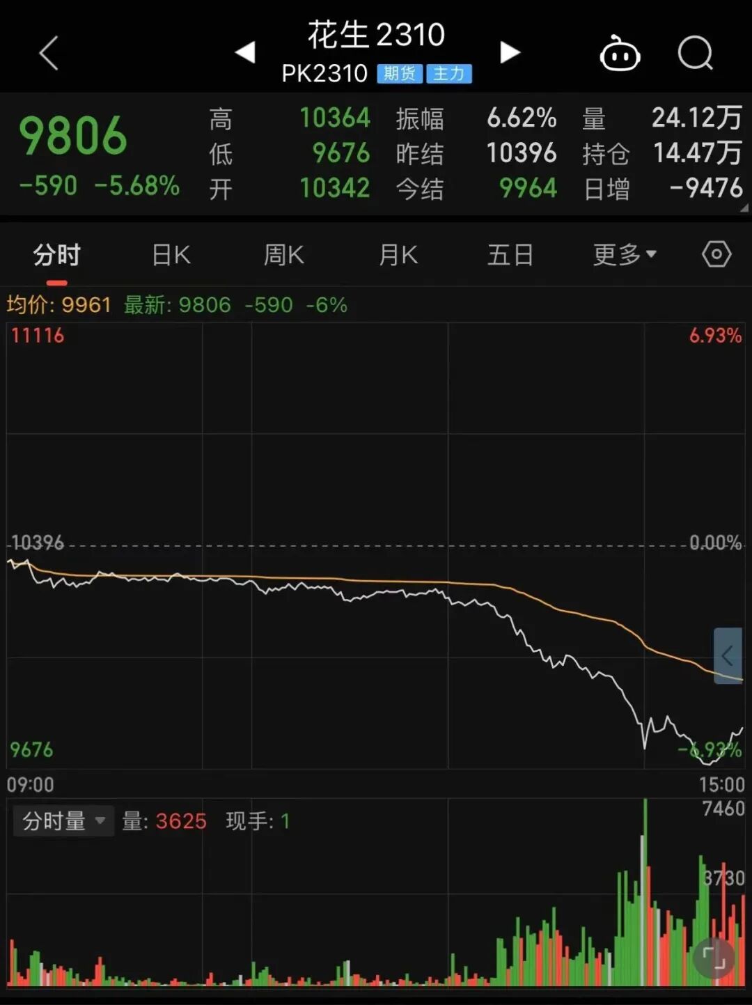 昨天下午,花生期货突然跳水,2310合约一度接近跌停。