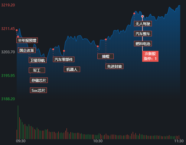 7月11日早盘,A股三大指数震荡回升。截至上午11:30,上证指数涨0.48%,报3219.20点,深证成指和创业板指涨幅分别为0.57%和0.51%;沪深两市成交额合计4670.7亿元,较上一交易日同期缩减6.32%。A股市场有3189只个股上涨,1764只下跌,涨跌停方面,有28只个股涨停,没有跌停。
