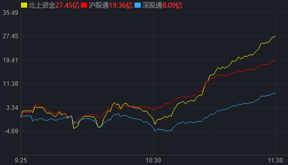 从资金面来看,7月11日上午,北上资金净买入金额达27.45亿元,其中,沪股通净买入19.36亿元,深股通净买入8.09亿元。