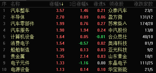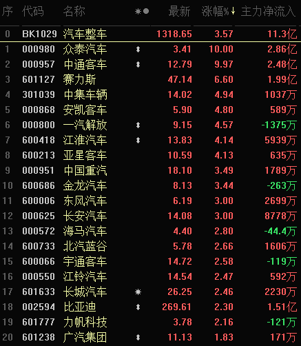 从早盘表现强势的汽车整车行业看,交易中的24只成份股中,有23只上涨,其中,有3只个股涨幅超5%。资金方面,有11.3亿元大单资金净流入该行业,居第2位。