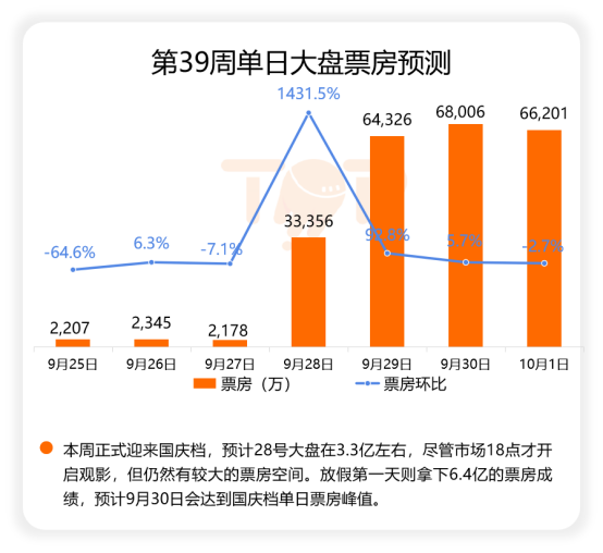 拓普数据认为,今年国庆档有多达10余部电影上映,预计9月30日达到单日票房峰值。尽管本届国庆档预售开启较晚,但拓普数据根据自研AI系统预测,今年国庆档大盘有望刷新影史纪录,中国电影市场有望再创辉煌。