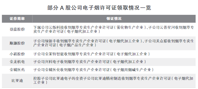 电子烟国家标准将于10月1日起实施。目前,已有7家A股公司通过旗下公司“领证”,包括比亚迪、劲嘉股份、顺灏股份、东风股份、小崧股份、金龙机电、金城医药,涉及电子烟的生产、销售、进出口等环节。