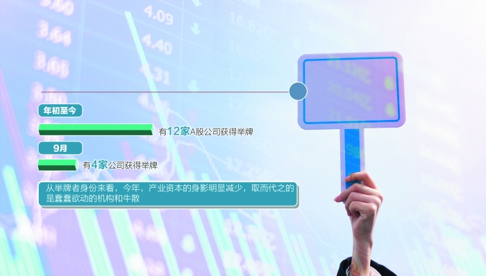 据上海证券报记者不完全统计,年初至今,已有12家A股公司获得举牌,9月尤为密集,共有4家公司获得举牌。浪潮涌动,意在狩猎“黑马”者有之,博取反转机会者有之,剑指控制权者亦有之。