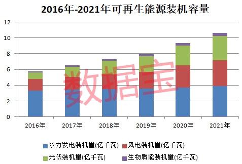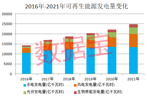 数据宝统计,截至2021年末,可再生能源发电量达到2.48万亿千瓦时,创下历史新高。在水电、风电、光伏、生物质能等四大可再生能源领域中,光伏发电量近五年增幅最高,达到3.92倍。2021年光伏发电量占可再生能源比达到13.1%,为历年来最高水平。