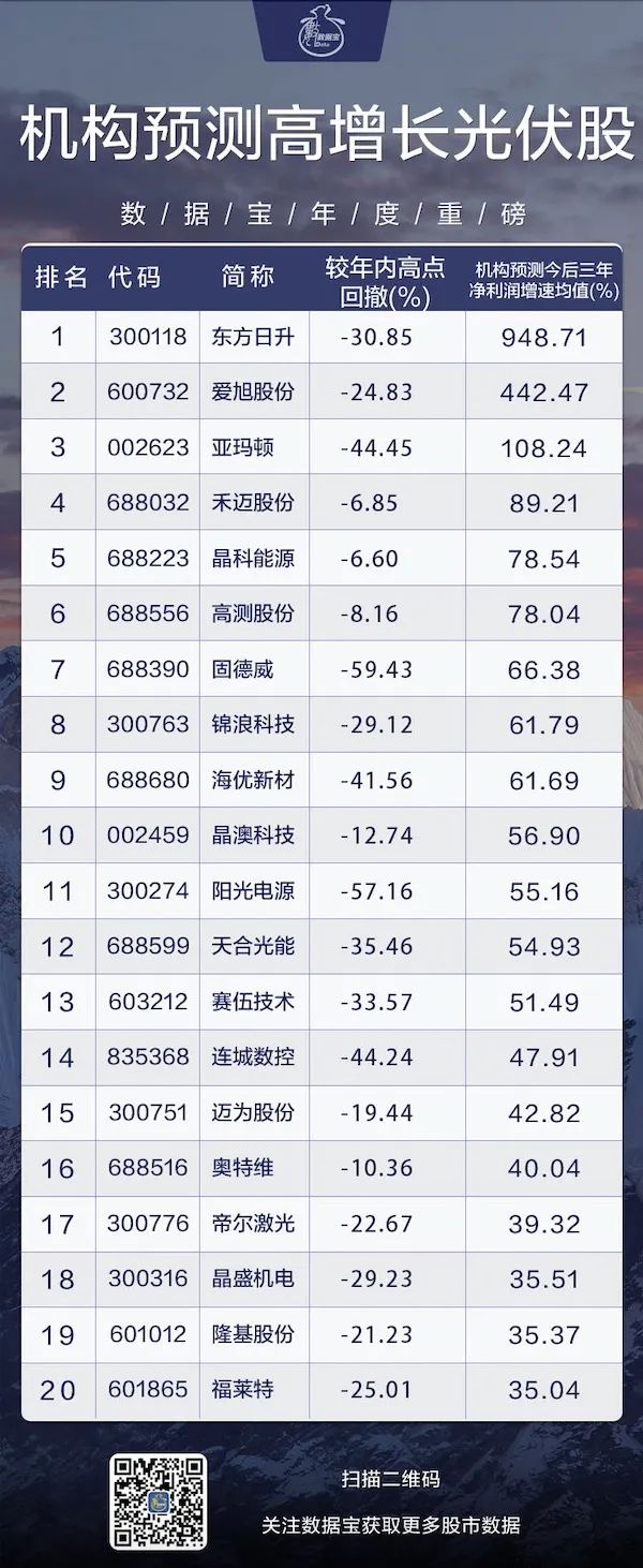 哪些光伏公司未来增长潜力较高?按照5家以上机构一致预测,23家光伏公司今后三年净利润增幅超20%。净利润平均增速最高的前五家公司分别是东方日升、爱旭股份、亚玛顿、禾迈股份、晶科能源。按照区间成交均价粗略计算,4月以来北上资金增持超亿元的有迈为股份、中环股份、阳光电源、捷佳伟创、固德威、锦浪科技等,迈为股份累计增持金额17亿元居首。(数据宝 梁谦刚)