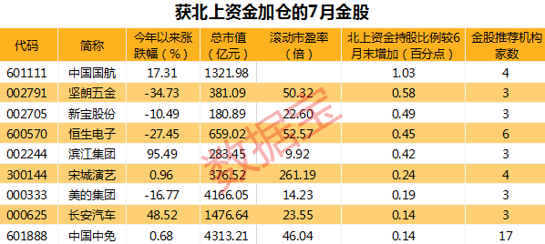 机构推荐的金股同时获外资关注,超半数获3家及以上券商推荐的金股7月份以来获得北上资金加仓,其中持股比例增长超0.1个百分点的有9只。