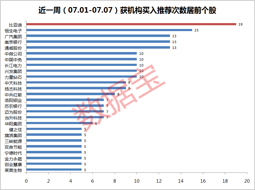 数据宝统计,共计62股获3次及以上机构评级。其中,比亚迪以19次评级居于首位。恒生电子、通威股份、南京银行等个股评级数量居前。
