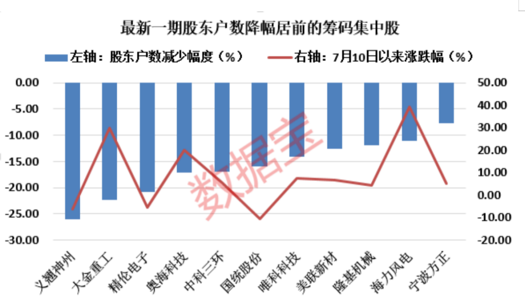 证券时报•数据宝统计,相比上期(7月10日)股东户数下降的股票有83只,义翘神州、大金重工、精伦电子等10股的股东户数降幅均超过10%。