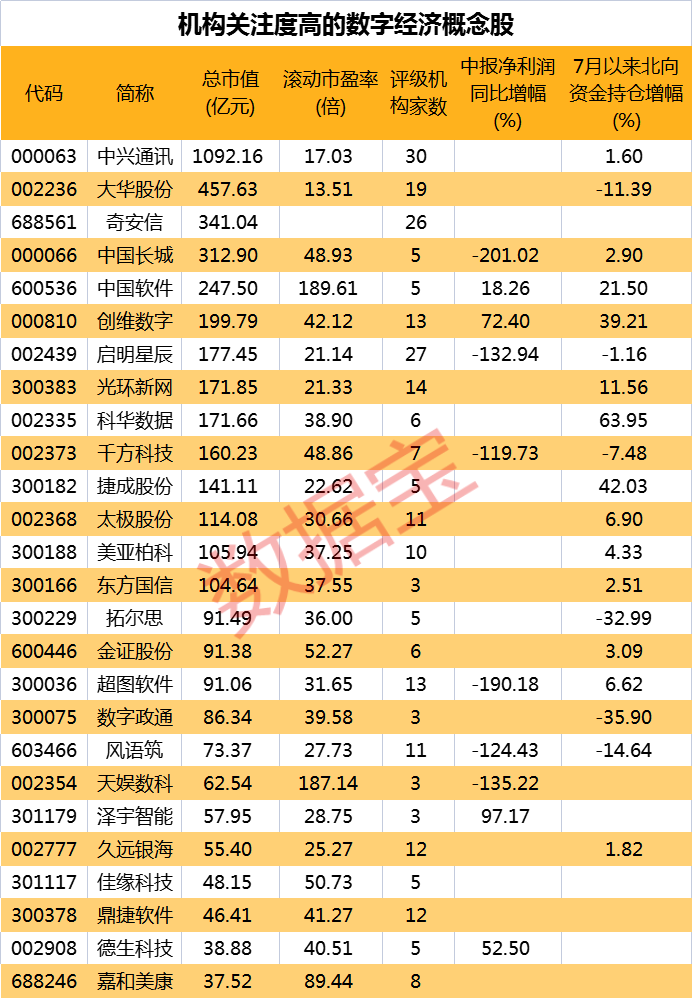 证券时报·数据宝统计,A股市场中,获得3家及以上机构共同关注的数字经济概念股共计26只。其中,中兴通讯关注度最高,评级机构共计30家;紧随其后的启明星辰和奇安信均有25家;大华股份、光环新网、创维数字等9股评级机构超过10家。