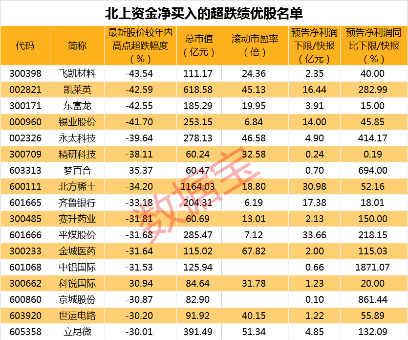 本周以来,凯莱英、平煤股份、锡业股份、立昂微等17股获北上资金净买入,陕西金叶、永太科技、平煤股份等21股主力净流入额累计录得正值。其中,飞凯材料、东富龙、北方稀土等超跌股市盈率均不足30倍。(数据宝