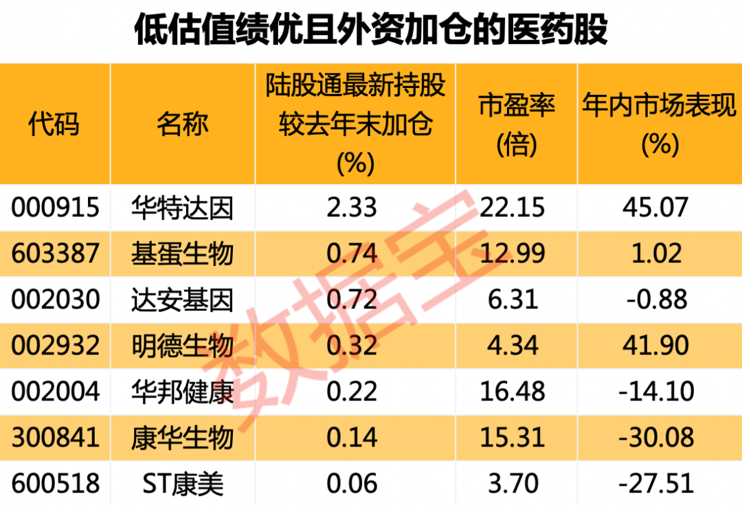 华特达因、基蛋生物获北上资金加仓幅度居前,前者加仓超过2个百分点。这7股年内平均上涨2.2%,华特达因、明德生物涨幅超过40%,康华生物、ST康美跌幅超过25%。(数据宝 张娟娟)