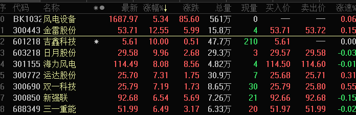 8月16日早盘,受“千乡万村驭风行动”消息刺激,风电板块大幅上涨。金雷股份、宏德股份盘中涨超12%。远大智能、南网能源、立新能源、中际联合、吉鑫科技、摩恩电气等封住涨停板。