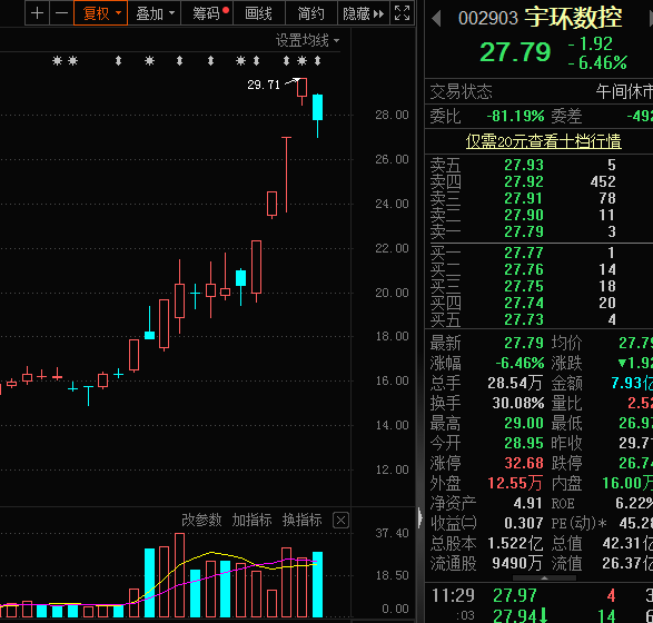 宇环数控今日早盘股价大幅走低,盘中跌幅超过9%。在此之前,宇环数控已录得四连板,股价创四年来新高。