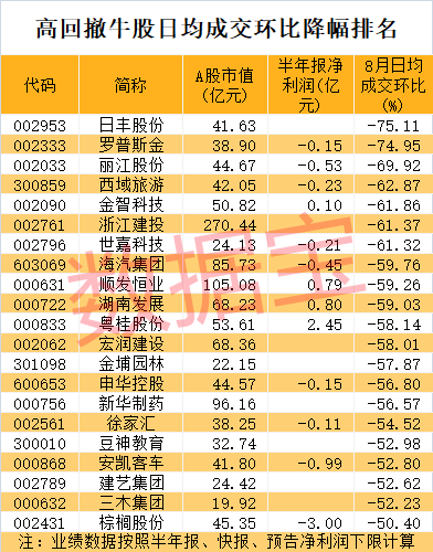 从日均成交额下滑幅度来看,日丰股份、罗普斯金、丽江股份是8月以来日均成交下滑最高的前三只。日丰股份下滑最为明显,公司8月以来日均成交额1.26亿元,而上个月日均成交高达5.07亿元,环比减少幅度达到75.11%。(数据宝 梁谦刚)