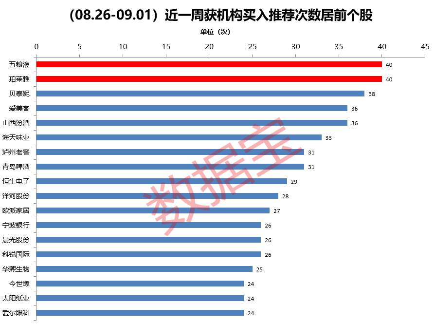 数据宝统计,共计198股获机构10次及以上评级。其中,五粮液、珀莱雅以40次评级居于首位;贝泰妮、爱美客、山西汾酒等个股评级数量亦超过35家。