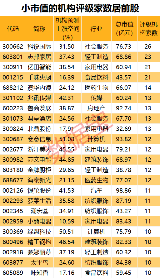 数据宝统计,10家以上机构评级的个股中,23股最新总市值不足100亿元,如兆讯传媒、蒙娜丽莎、太平鸟等。