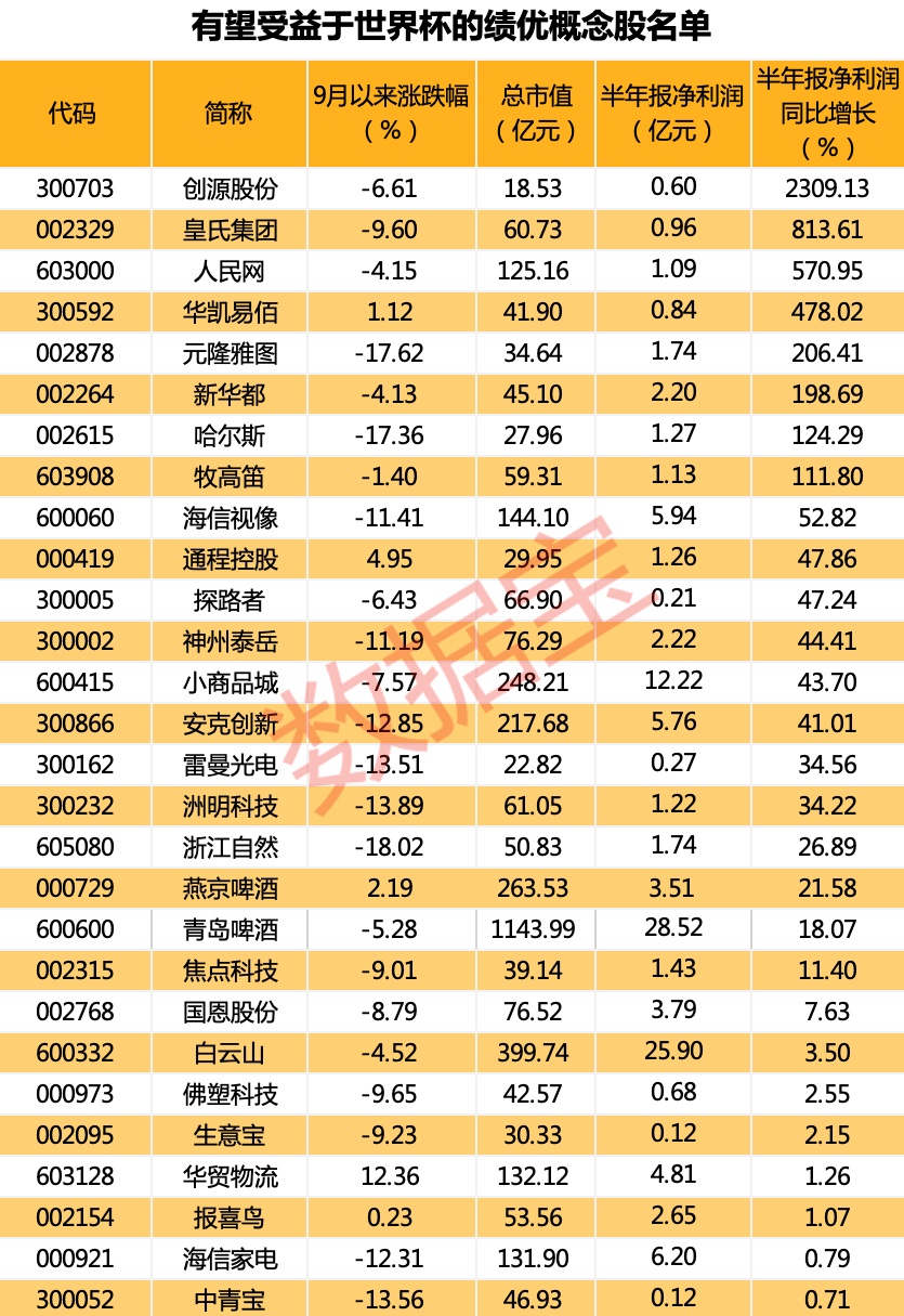 数据宝统计,28只概念股上半年实现盈利且同比实现增长,青岛啤酒、白云山、小商品城的上半年归母净利润额居前;创源股份、皇氏集团、人民网等8股的业绩同比呈现翻倍增长。